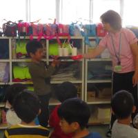 1年生が作った秋のおもちゃに、園児さんもにっこり笑顔。
