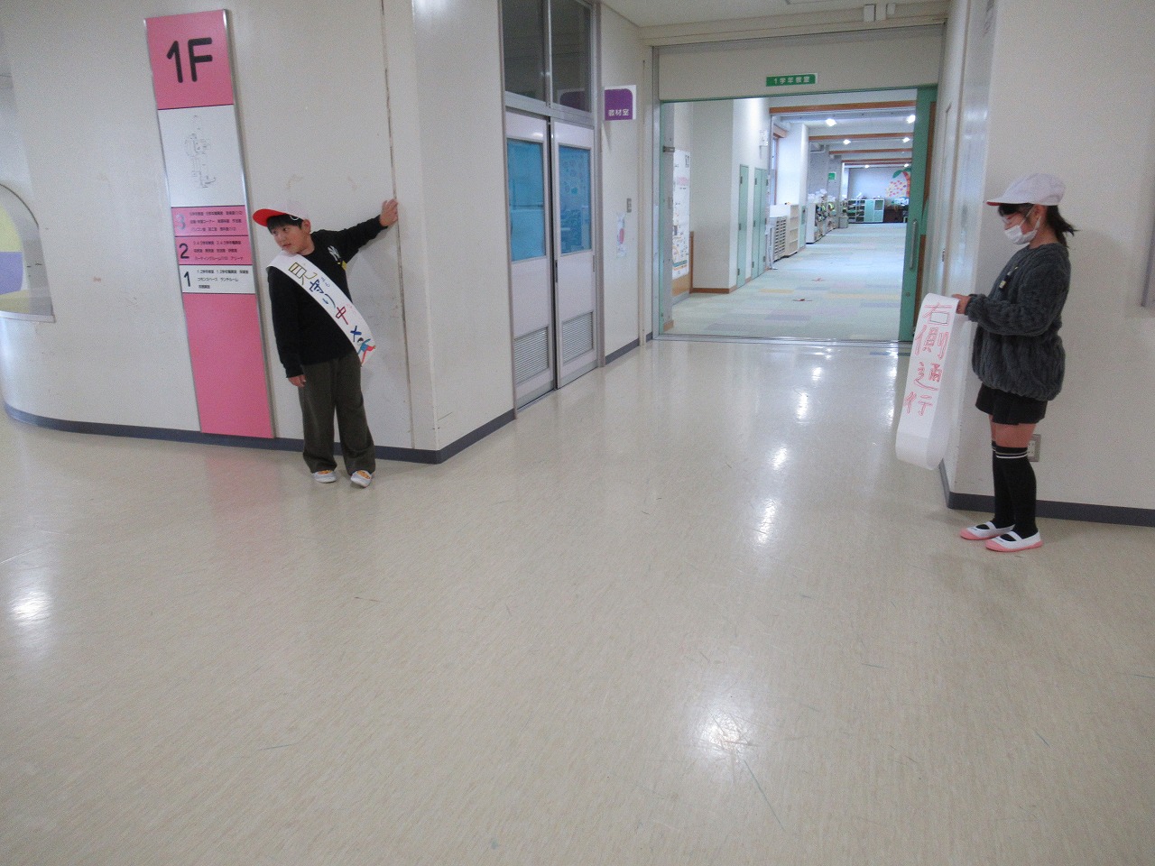 不審者に扮した教員が2年生フロアに侵入すると、2年部の教員は児童に、1年生フロアに逃げるように指示をし、携行している防犯笛を吹き鳴らしながら素早く避難しました。